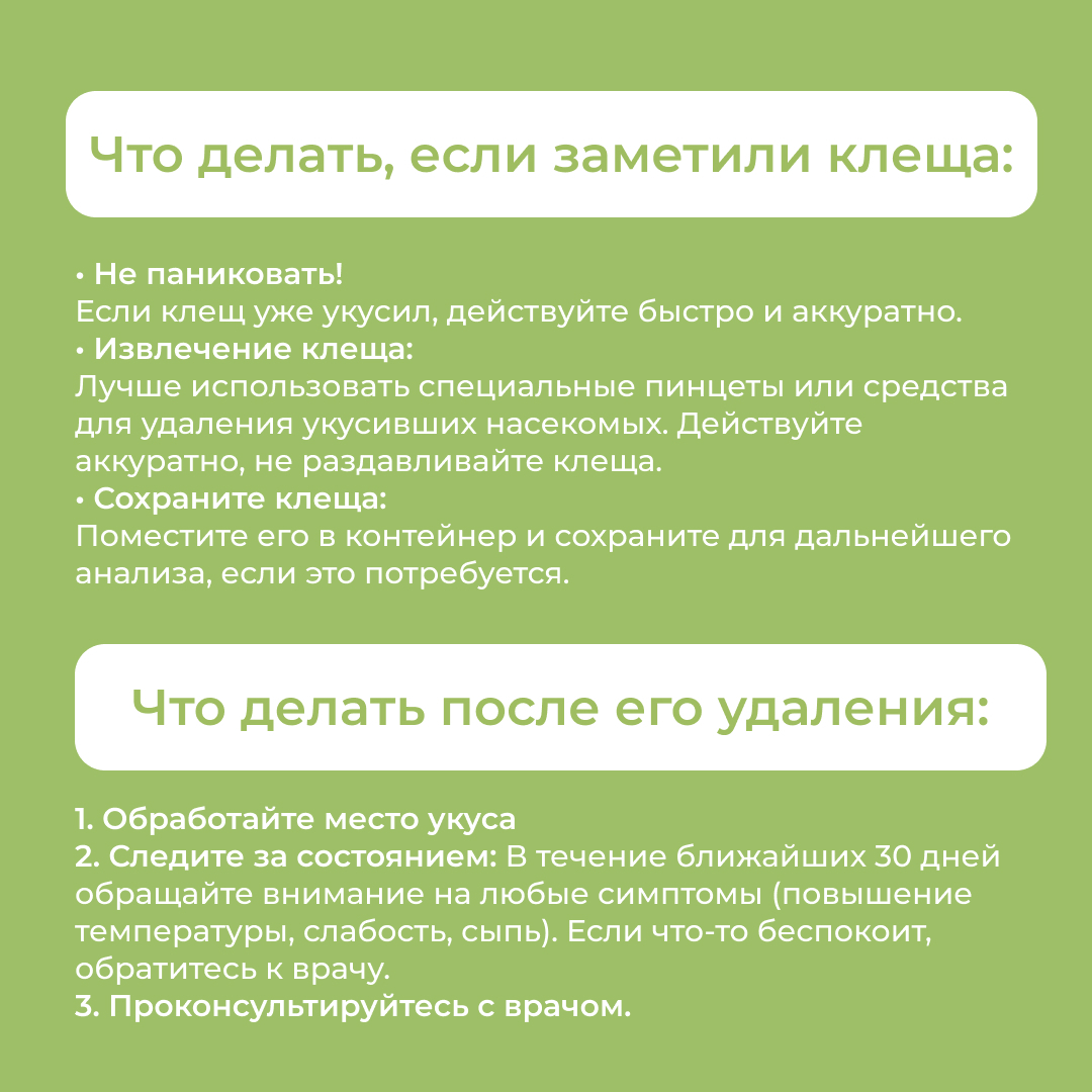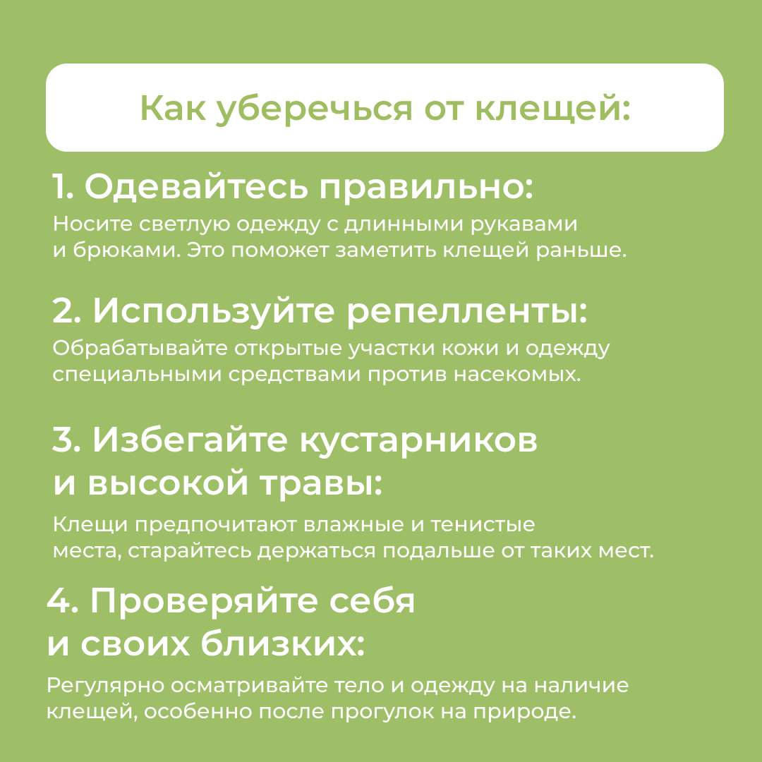 С началом теплых месяцев активно активизируются клещи. Не дайте этому маленькому врагу испортить ваши планы на природу! Вот несколько советов по защите и действиям в случае укуса, листайте карусель