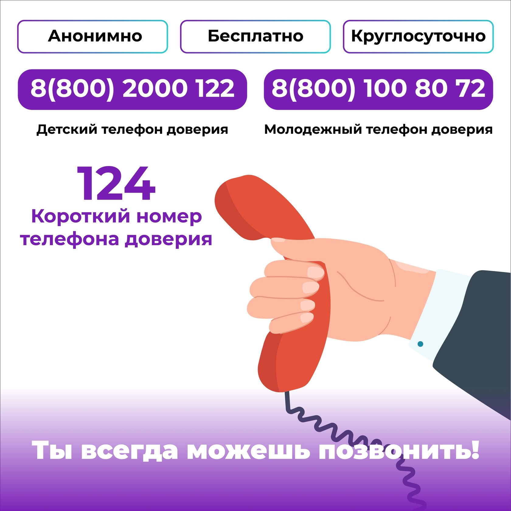 Помните, сотрудники телефонов доверия работают круглосуточно и оказывают услуги анонимно и бесплатно.