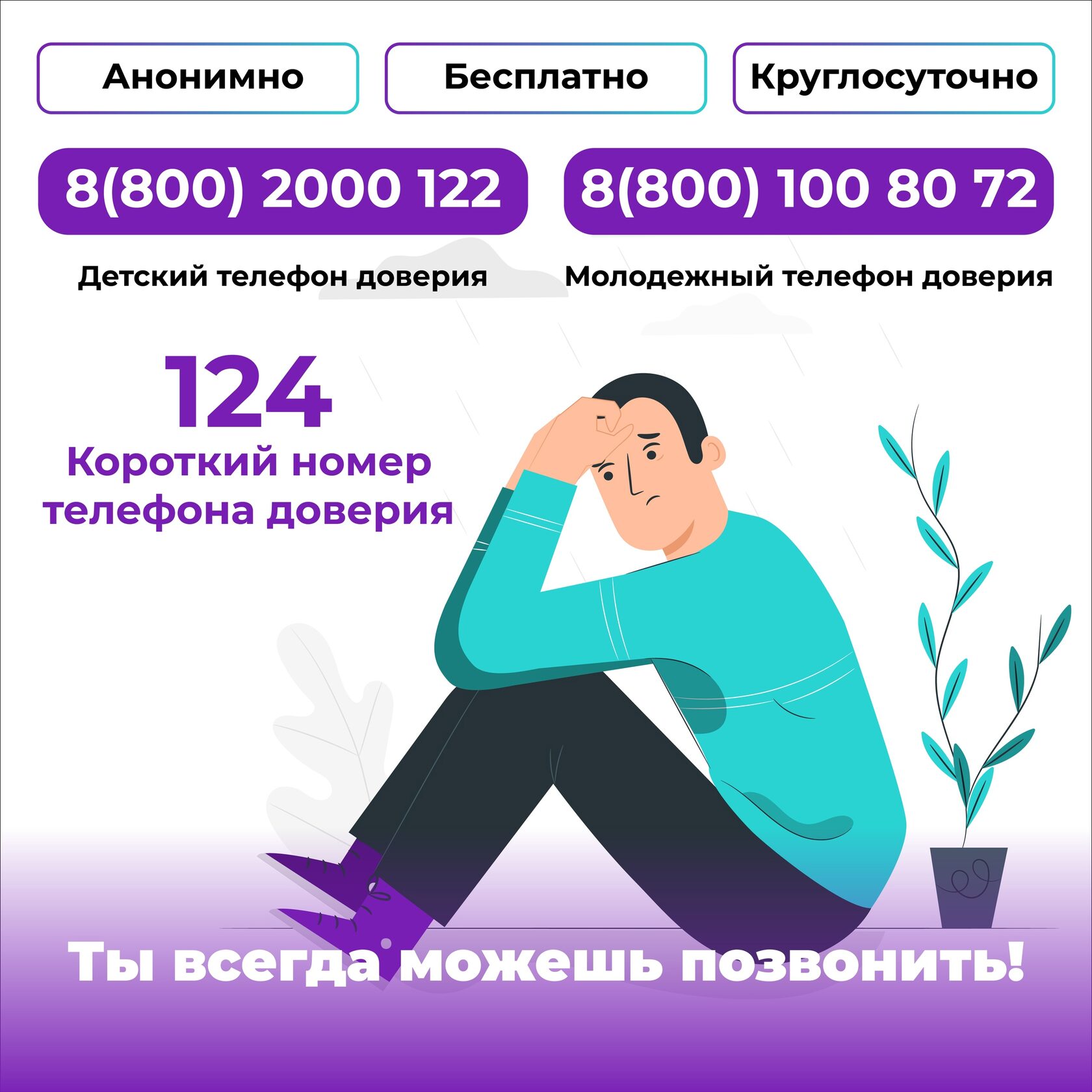 В трудную минуту важно знать, что ты не один. Телефон доверия — это место, где тебя выслушают, поддержат и помогут, анонимно и бесплатно.